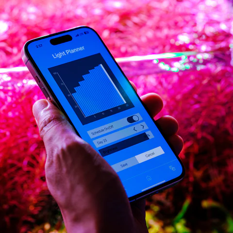 Pair LightControl Pro via Bluetooth; select spectrum, set intensity, and program sunrise/sunset.